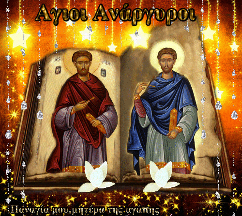 Ἅγιοι Ἀνάργυροι καὶ θαυματουργοί, ἐπισκέψασθε τὰς ἀσθενείας ἡμῶν, δωρεὰν ἐλάβετε, δωρεὰν δότε ἡμῖν.